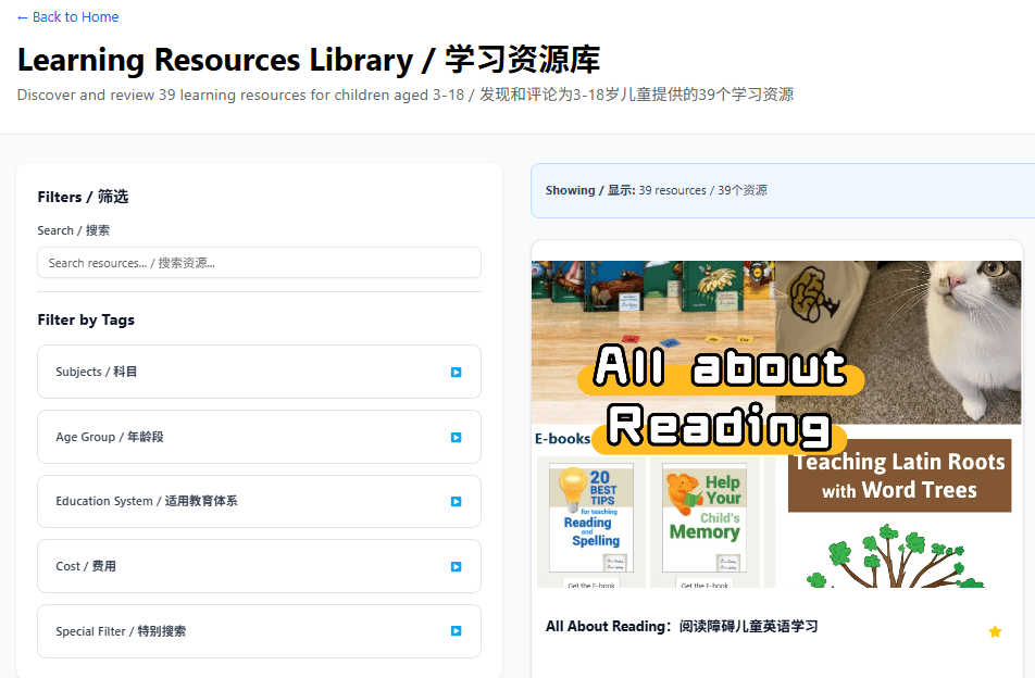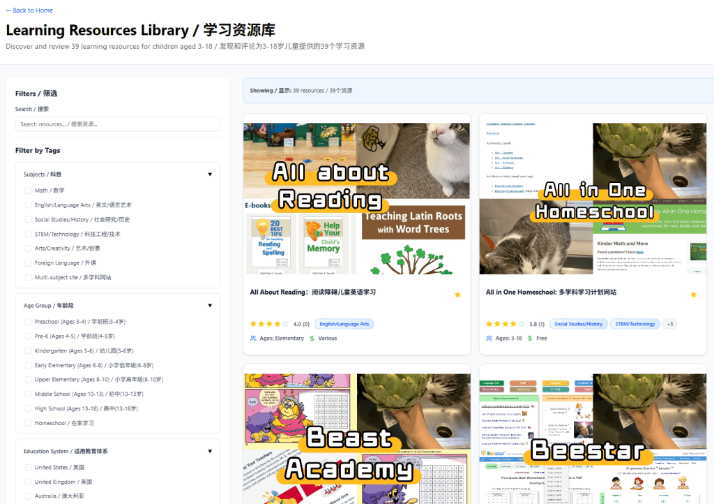You can explore resources using different filters and tags, such as subject, age group, education system, cost, and other specific criteria. 您可以使用不同的筛选条件和标签来浏览资源,例如学科、年龄段、教育体系、费用以及其他搜索条件。