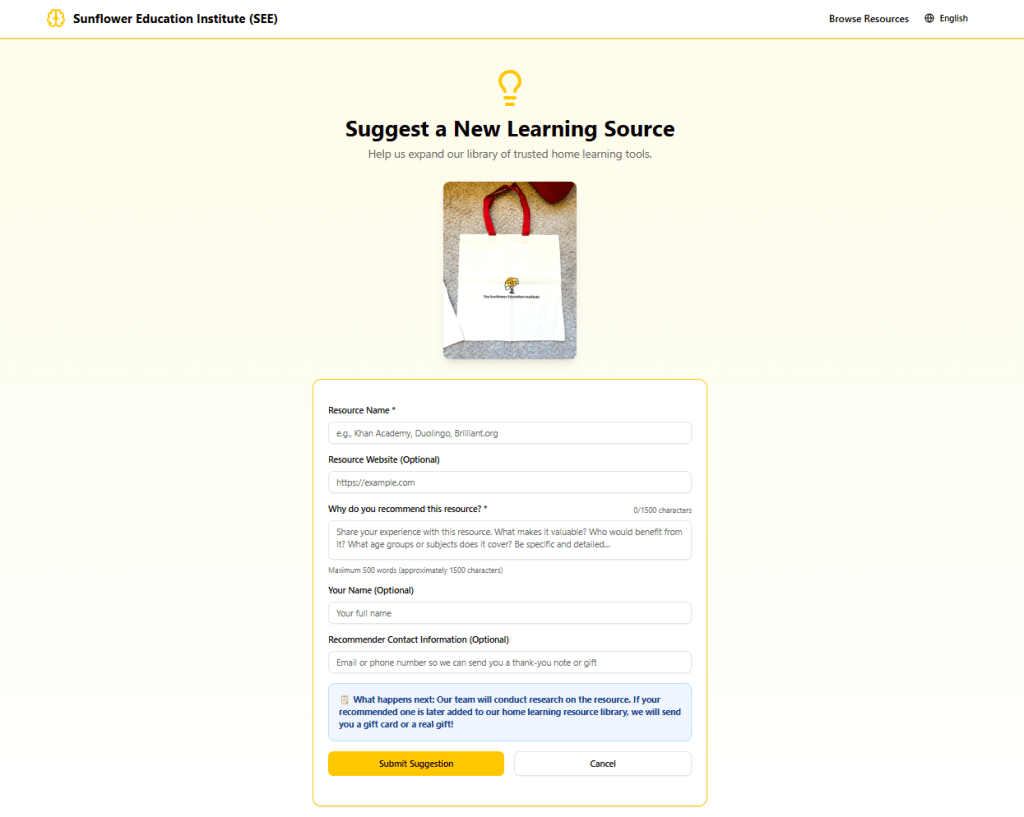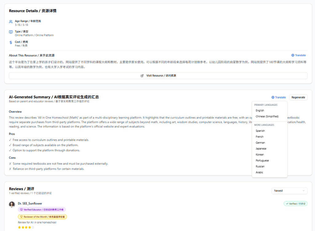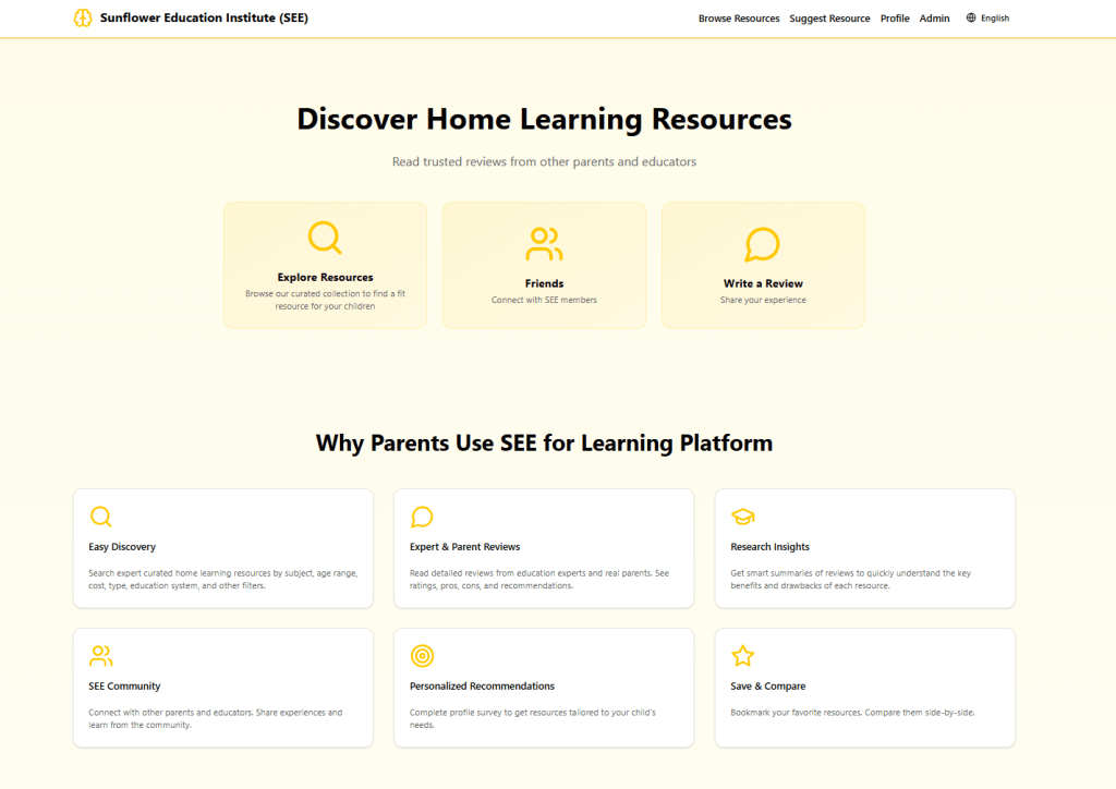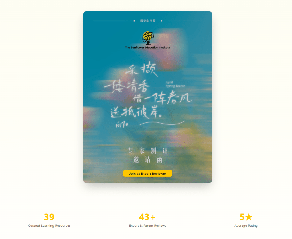 Seeforlearning.org is a platform designed to help parents make informed decisions in home learning resource navigation. It brings together research-based insights and real experiences from other families in one place. Below are our suggested ways to explore the test version. Your feedback and contributions will help our team refine the platform’s features and support its full launch. 寻找向日葵(seeforlearning)是一个旨在协助家长寻找在家学习资源的平台。平台提供在家学习资料的研究解读和家长测评。我们列出了如何使用测试版平台的建议方式。您的反馈将有助于我们团队完善平台功能以及平台正式的上线。